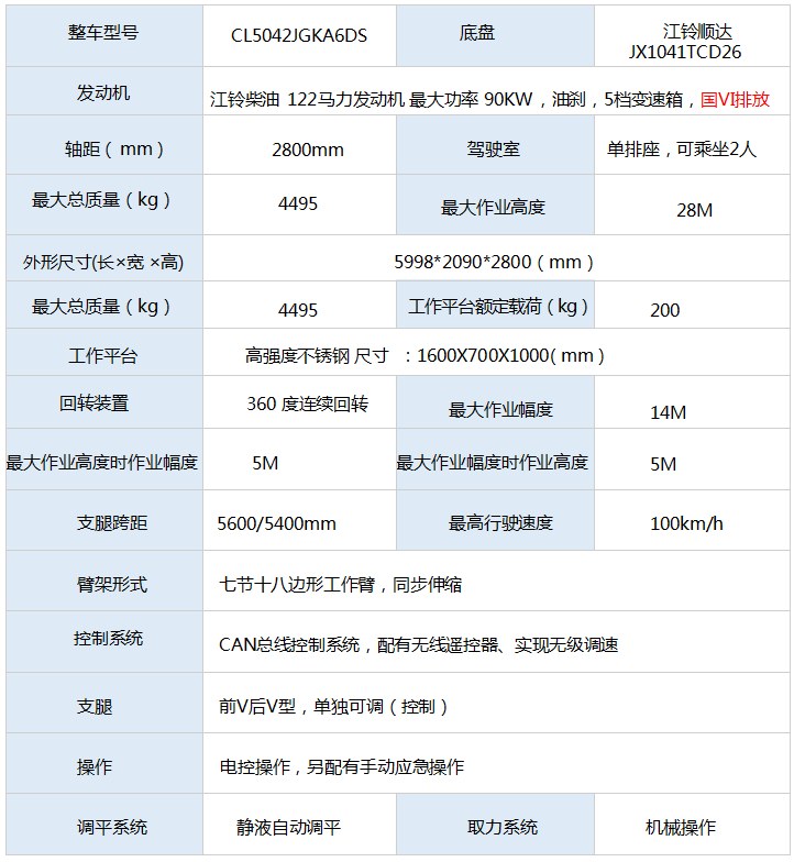 二、上装配置:整车采用 CAN 总线系统,并配备无线遥控器,360°可旋转作业平台 ,H型支腿,横向跨距更宽,稳定性更强。转台和吊篮设有启动和熄火开关,配置应急泵。作业高度28米。