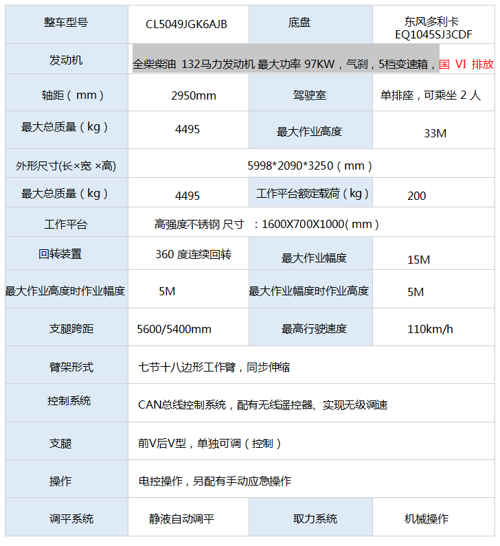 二、上装配置:整车采用 CAN 总线系统,并配备无线遥控器,360°可旋转作业平台 ,H型支腿,横向跨距更宽,稳定性更强。转台和吊篮设有启动和熄火开关,配置应急泵。作业高度33米。
