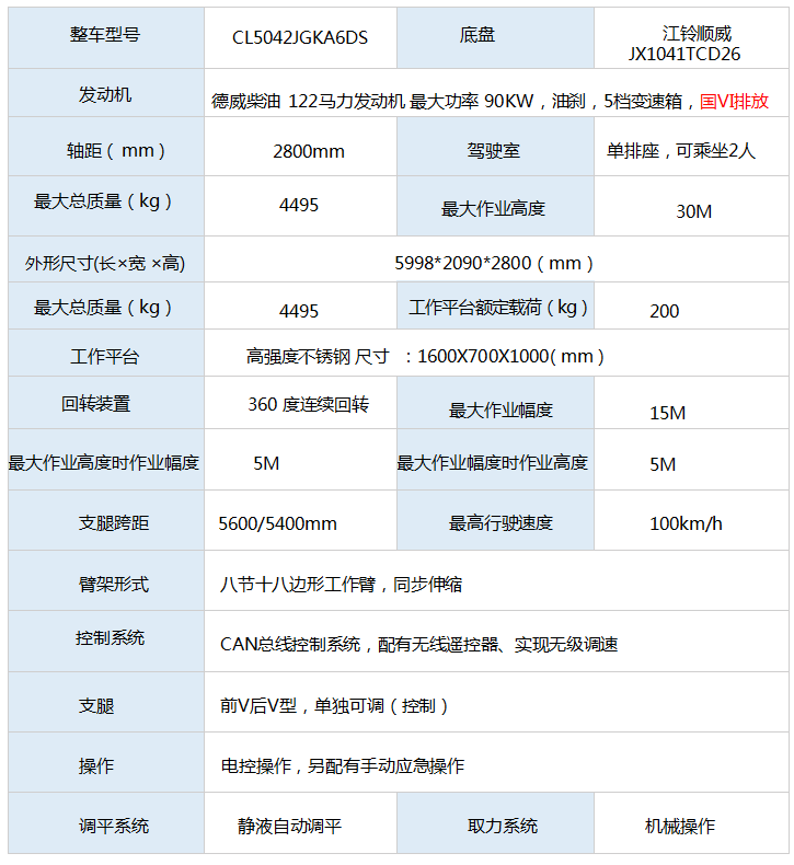 二、上装配置:整车采用 CAN 总线系统,并配备无线遥控器,360°可旋转作业平台 ,H型支腿,横向跨距更宽,稳定性更强。转台和吊篮设有启动和熄火开关,配置应急泵。作业高度30米。