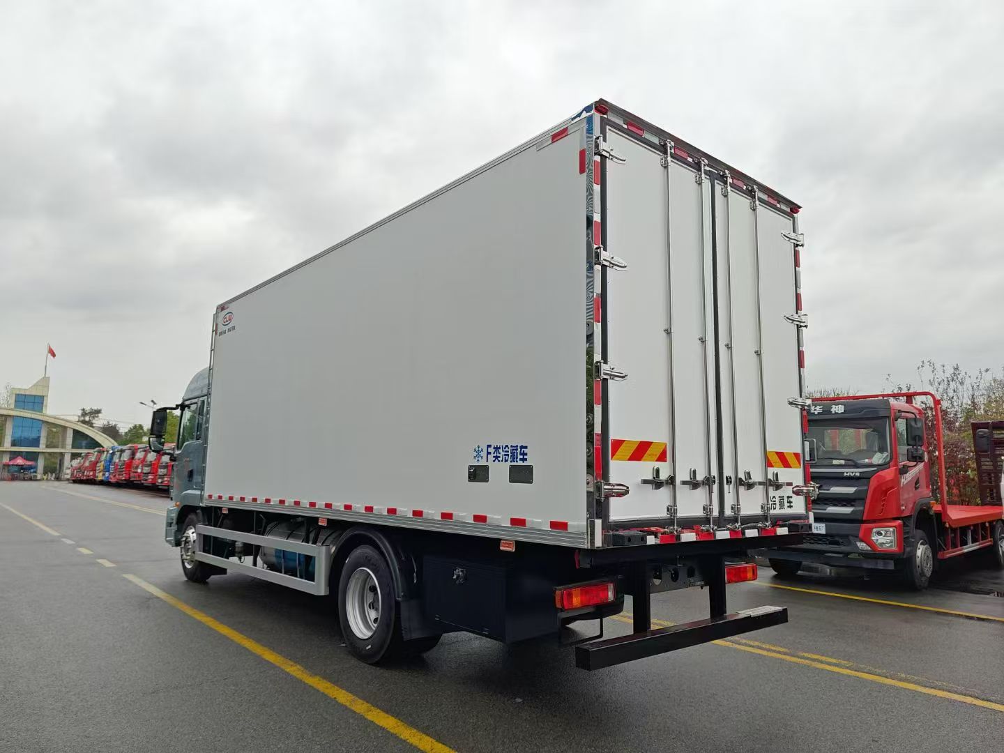 二、厢体配置:采用我公司真空吸附、液压吸附、断热桥技术,大型恒温热压,无缝合成,一次成型工艺制造而成,保温性能达到规定标准。厢体内部尺寸:6800 *2450*2600(mm),容积为43立方。厢体内外采用新款纳米玻璃钢板(不吸光、隔热性好、硬度强、抗氧化),中间保温层为8公分厚保温板,砸不乱底板,LED照明灯及示宽灯,高密闭性门板隔温套件,全密封锁温压条,高韧性不锈钢锁件。