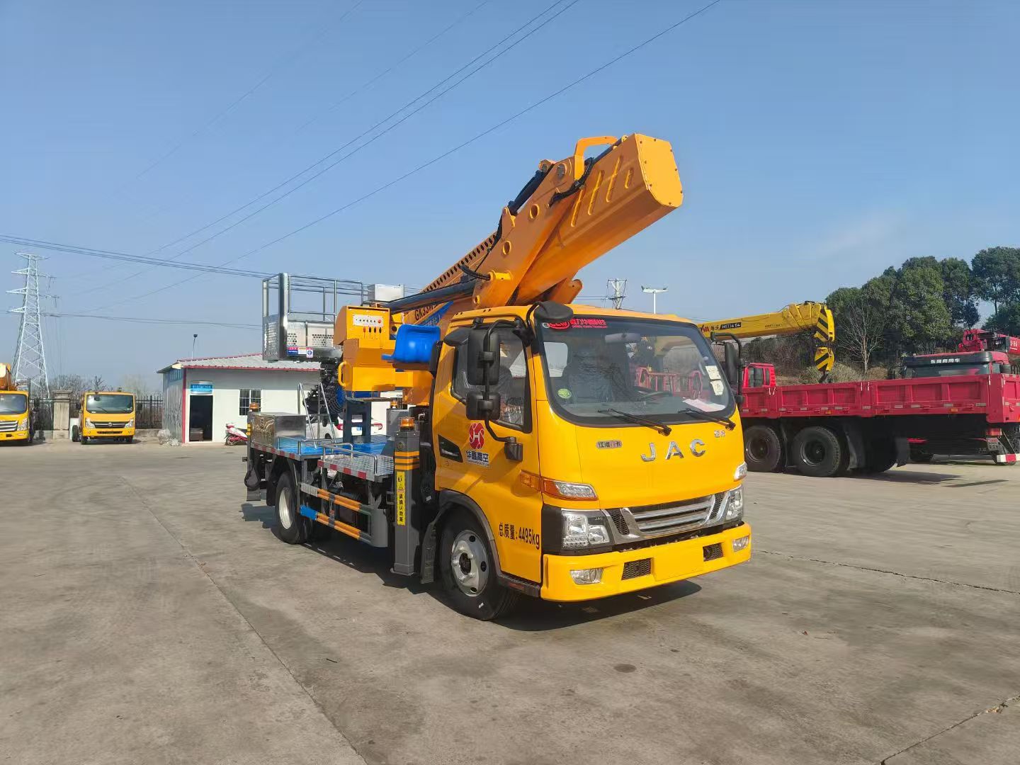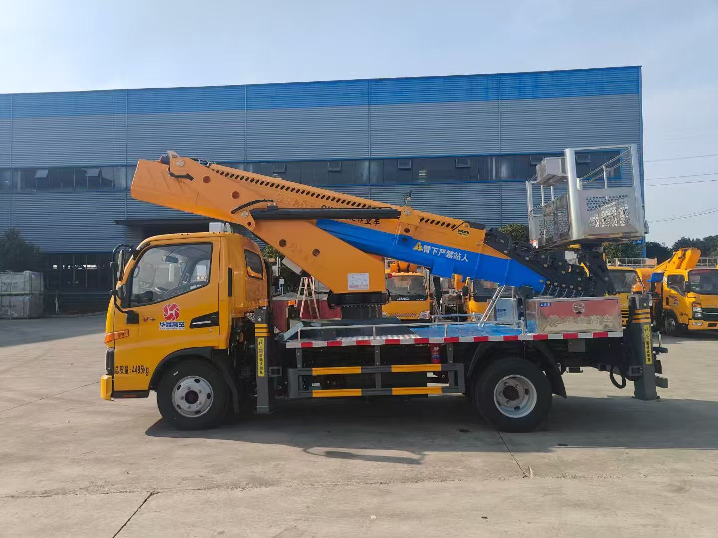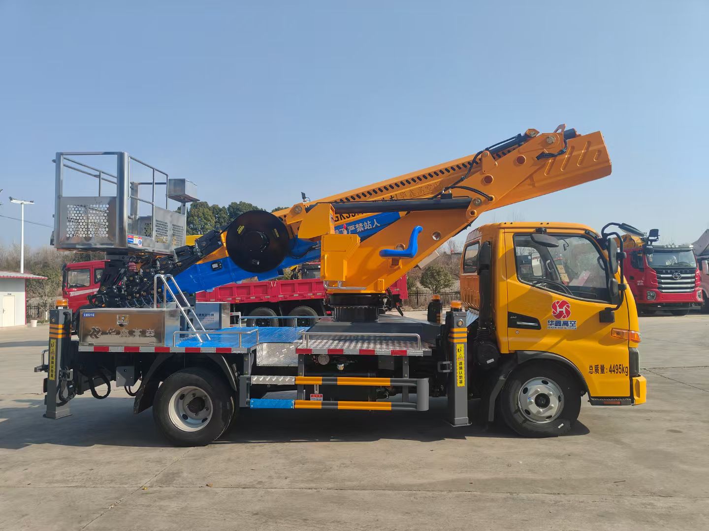 二、上装配置:整车采用 CAN 总线系统,并配备无线遥控器,360°可旋转作业平台 ,H型支腿,横向跨距更宽,稳定性更强。转台和吊篮设有启动和熄火开关,配置应急泵。作业高度33米。