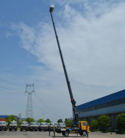 二、上装配置:整车采用 CAN 总线系统,并配备无线遥控器,360°可旋转作业平台 ,H型支腿,横向跨距更宽,稳定性更强。转台和吊篮设有启动和熄火开关,配置应急泵。作业高度28米。